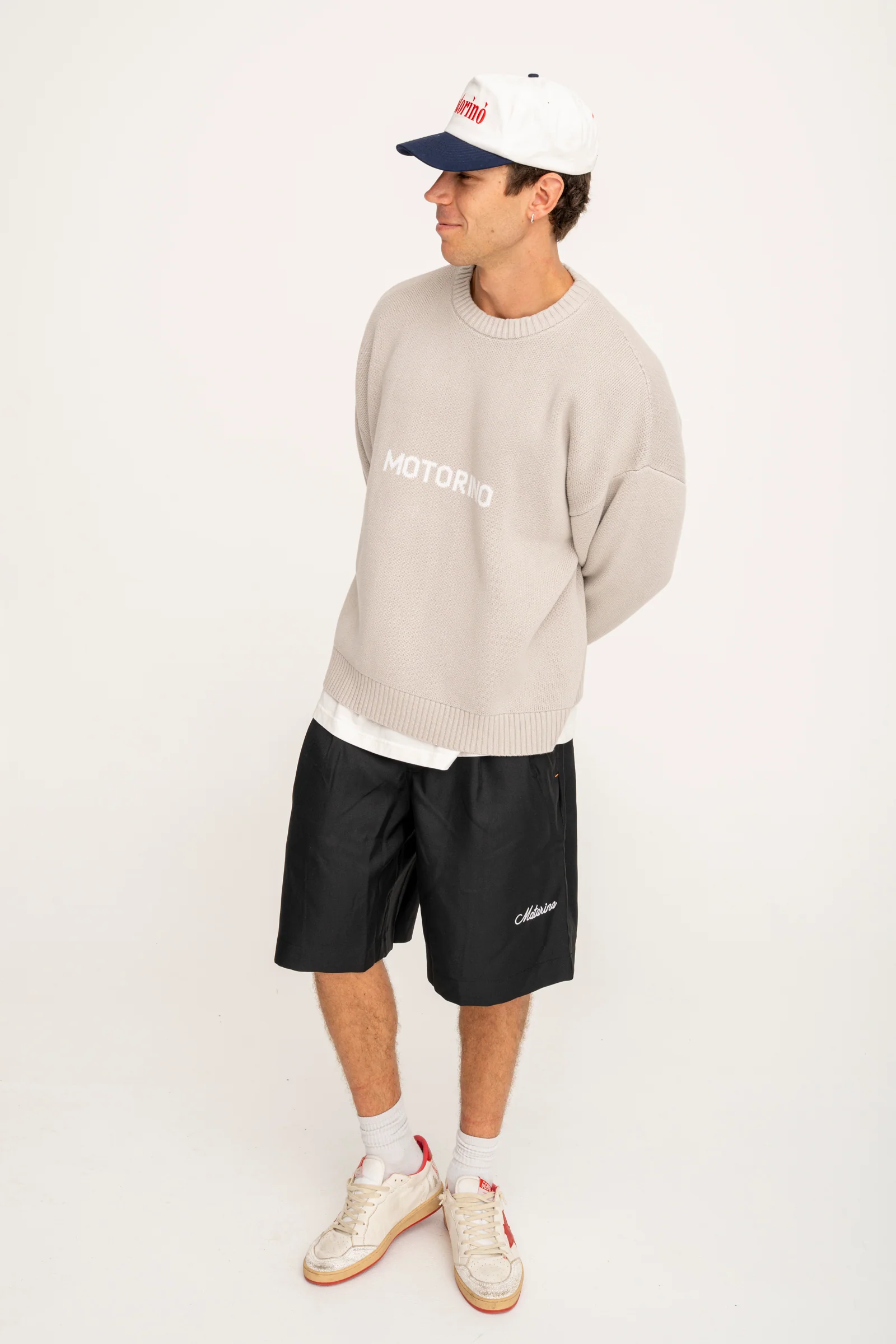 - Overcast grey garment infused with cloudy Motorino branding