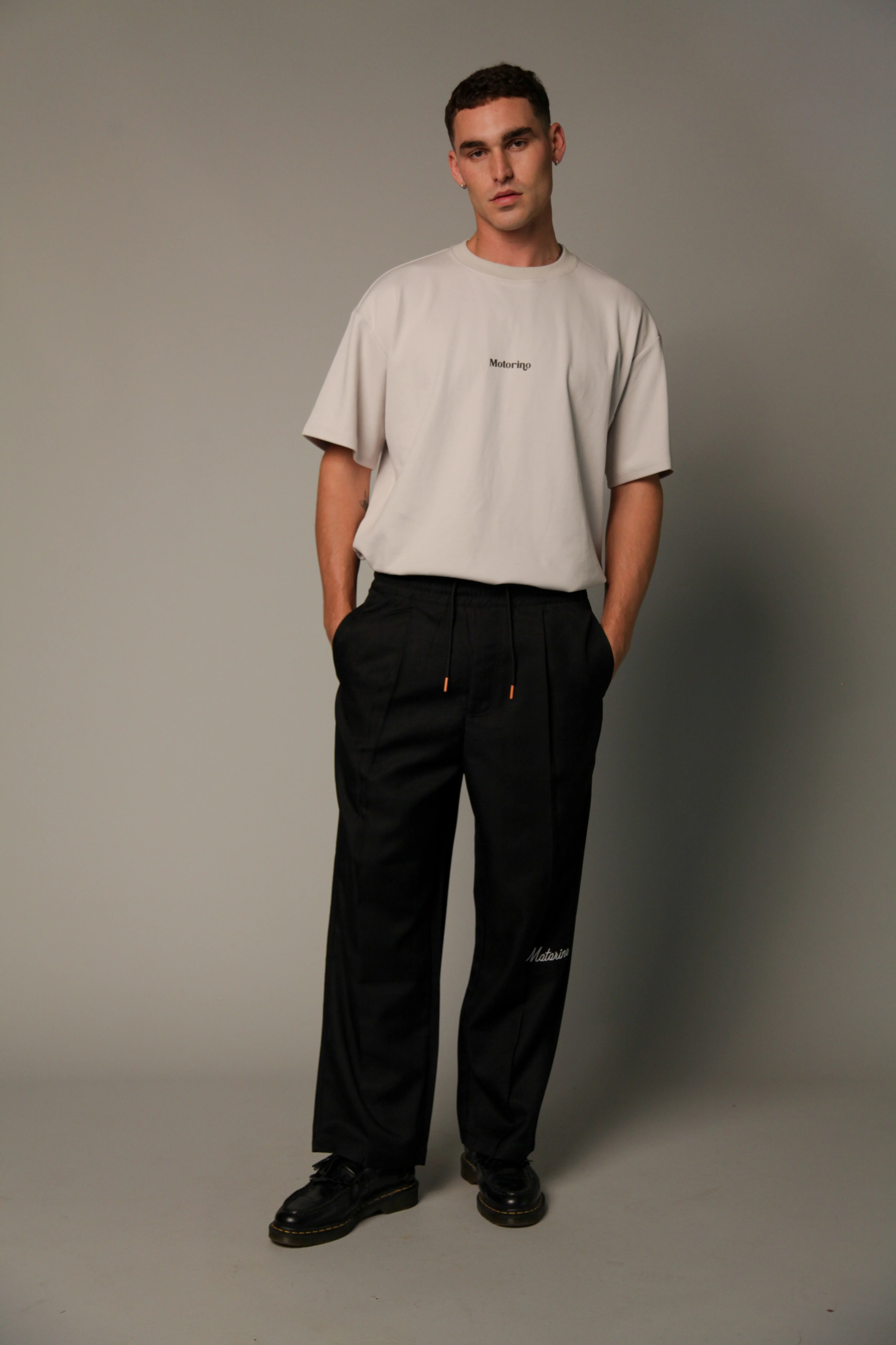 These are the ultimate versatile black pant for any wardrobe, any moment, 365 days a year. Made with Polyester twill, they have a nice shine, making them perfect for dressing up, yet casual enough to wear with anything. A straight leg finish. Featuring a popping peach pip label on the right leg and Motorino chain stitch embroidery on the left shin.